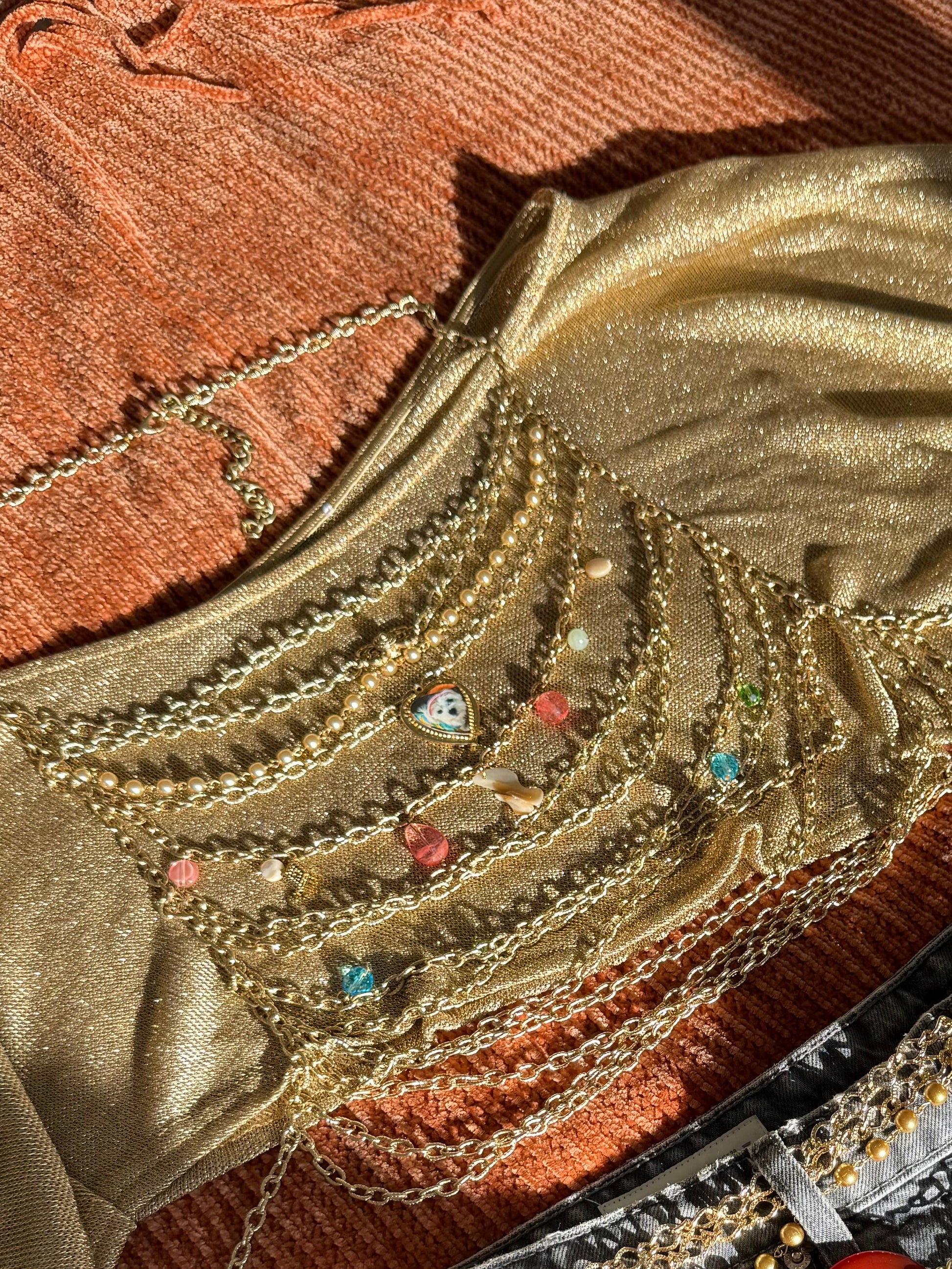 A layered body chain detailed with miniature photo frames, turning the piece into a wearable gallery wall.that attaches at the neck and the back, creating a natural, effortless silhouette that moves with you.